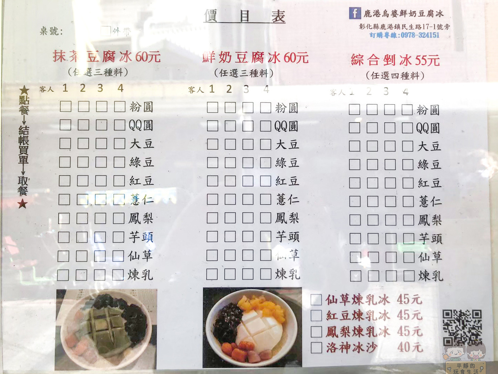 這天我們來到彰化老街天后宮拜拜完後,立刻跑來旁邊吃當地人很推薦的「鹿港烏婆鮮奶豆腐冰」。裡面最熱門的招牌就是使用抹茶、鮮奶製成的豆腐再搭配紅豆、綠豆、粉圓...等數十種配料的平價消暑甜品。雖然沒有開放內用,但是在門口外還是有擺放兩張座位,簡單的提供客人用餐,人多時需要和他人併桌哦!